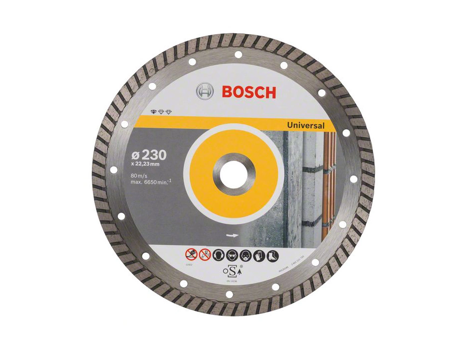 Die Diamanttrennscheibe Standard for Universal Turbo ermöglicht zuverlässiges Schneiden in allgemeines Baumaterial. Die Diamantmatrix ist zum Schneiden unterschiedlichster Materialien ausgelegt und ermöglicht saubere und rissfreie Schnittflächen. Das Bosch Kompetenzzentrum Diamant in der Schweiz gewährleistet den hohen Qualitätsstandard. Geeignet zum Schneiden von Baumaterial wie Beton und Mauerwerk Durchmesser mm: 230, Bohrungsdurchmesser mm: 22,23, Schnittbreite mm: 2,5, Segmenthöhe mm: 10