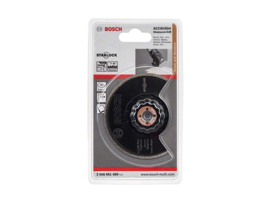 Diamant-Riff Segmentsägeblatt ACZ 85 RD4. Das Segmentsägeblatt Starlock ACZ 85 RD4 mit garantiert hoher Lebensdauer beim Entfernen von Mörtel und abrasivem Material. Die Schneidekante ist für außergewöhnliche Verschleißfestigkeit mit hochwertigem Diamant-Riff der Körnung 40 besetzt. Dieses Blatt ist ideal geeignet für das Ausfräsen von Fliesenfugen und das Sägen kleinerer Ausschnitte in weiche Wandfliesen. Auch lassen sich mit ihm präzise Aussparungen in abrasive Materialien wie glasfaser- und epoxidharzverstärkte Kunststoffe, Zementfaserplatten und faserverstärkte Verbundwerkstoffe sägen. Es ist kompatibel mit allen Elektrowerkzeugen des Typs Starlock, Starlock Plus und Starlock Max sowie allen gängigen Multifunktionswerkzeugen. Die spitzen Sägeblattenden ermöglichen das Arbeiten in schwer zugänglichen Ecken und der runde Teil des Blatts gerade Schnitte. Das Starlock-Aufnahmesystem ermöglicht einen schnellen Blattwechsel ohne Blattberührung in drei Sekunden. Das Aufnahmesystem ermöglicht durch seine dreidimensionale enge Passung maximale Kraftübertragung zwischen Maschine und Zubehör.