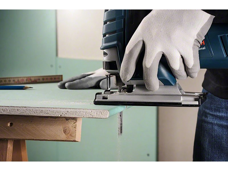 Stichsägeblatt T 141 HM Special for Fibre and Plaster. Das T 141 HM Special for Fibre and Plaster Stichsägeblatt ist besonders robust bei geraden Schnitten in dicken und dünnen Sonderwerkstoffen. Die geschliffenen, geschränkten Hartmetallzähne sind für eine lange Lebensdauer beim Schneiden von hochabrasiven Materialien auf Mineralbasis konzipiert. Die Zahnleiste ist zudem mit der Hartmetalltechnologie an einen hochelastischen Kohlenstoffstahlkörper geschweißt, wodurch das Blatt durch die robustesten abrasiven Materialien, wie z. B. Zementfaserplatten, Gipskartonplatten, Porenbeton und glasfaserverstärkten Kunststoff, schneiden kann. Es ist mit einer großen Zahnteilung (4,3 mm) und einer Länge (100 mm) ausgestattet, um Faser- und Gipsmaterialien mit einer Dicke von 5 bis 50 mm zu schneiden. Für den Gebrauch mit Stichsägen mit T-Schaft-Aufnahme. Einnockenschaft. Für Fiber- und Zementstoffe. Einsatzbereiche: Für GFK/Epoxy von 5 bis 20 mm Stärke. Für Gipskarton und Zementfaserplatten von 5 bis 50 mm Stärke. Inhalt der Verkaufspackung: 3 Stück.