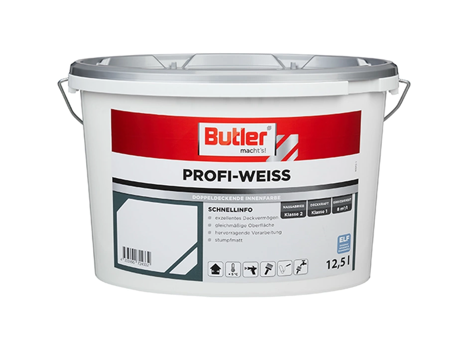 Einschicht-Dispersionsinnenfarbe für scheuerbeständige und diffusionsoffene Anstriche auf Wand- und Deckenflächen im gesamten Wohn- und Arbeitsbereich. Butler macht’s! PROFI-WEISS ist hervorragend zu verarbeiten und trocknet gleichmäßig auf. Im Renovierungssektor wird oft mit nur einem Anstrich ein optimales Ergebnis erzielt.