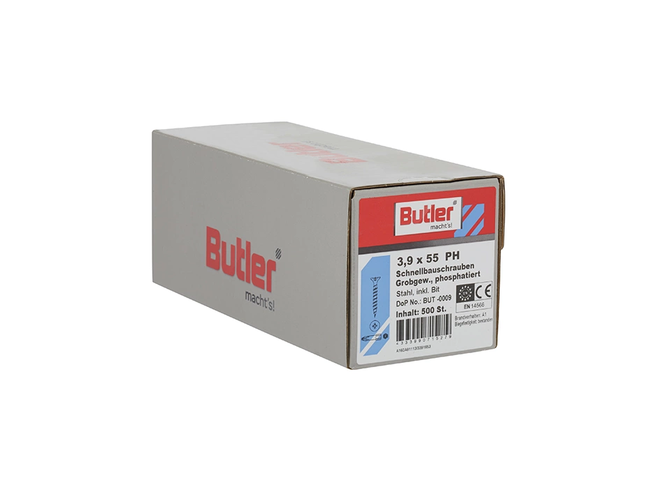 Die Schnellbauschrauben von Butler macht´s! mit Grobgewinde werden zur Befestigung von Gipskartonplatten auf Holzunterkonstruktion verwendet. Die Schrauben haben einen speziellen Trompetenkopf, Holzgewinde (eingängig) und Nadelspitze. Sie sind aus Stahl gefertigt, einsatzgehärtet und haben eine phosphatierte Oberfläche.