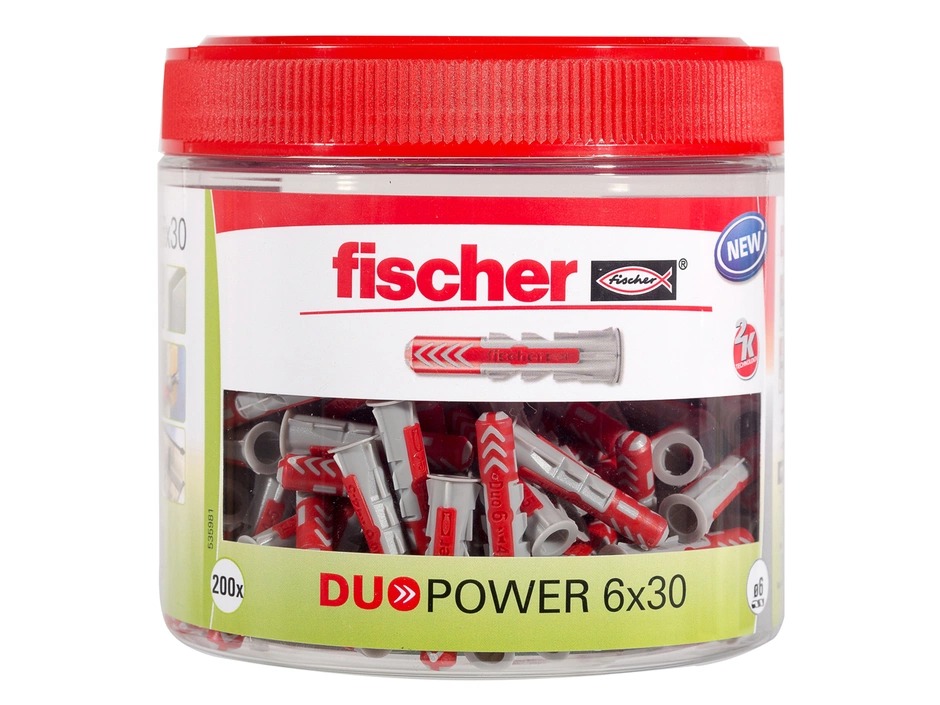 Der fischer Duopower bietet sehr gute Haltewerte durch 2 Komponenten: Die graue Komponente aus hochwertigem Nylon aktiviert je nach Baustoff automatisch das optimale Funktionsprinzip (Spreizen, Klappen, Knoten) für besten Halt. Die Expansionsflügel der roten Komponente unterstützen die sichere Verspreizung und bieten zusätzliche Sicherheit zur grauen Komponente. Einfaches Eindrehen der Schraube und richtiges „Ziehen“ zum Schluss. Kein Überdrehen der Schraube. Der am Dübelkopf angeformten Rand verhindert, dass der Dübel ins Bohrloch rutscht.