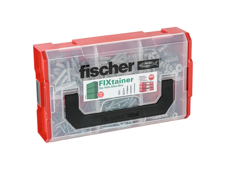 Die Hält-Alles-Box enthält neben dem fischer SX den Nylondübel UX R, den schnellen Gipskartondübel GK und den selbstbohrenden Gipskartondübel Metall GKM (240 Teile). Die Fixtainer-Boxen sind mit Tragegriff und transparentem Deckel ausgestattet. Sie können fest miteinander verbunden und damit gestapelt werden. Zudem sind sie kompatibel mit dem Sortimo L-Boxx System.