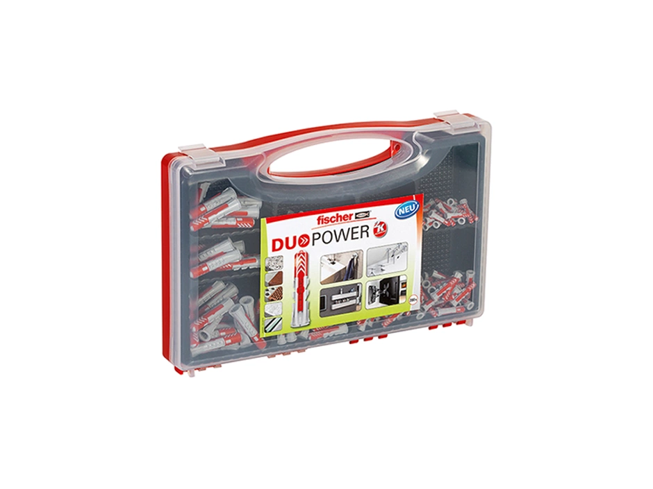 Die fischer FIXtainer beinhaltet in einer praktischen und universell zu nutzenden Box für die häufigsten Anwendungen und Baustoffe Dübel, Schrauben und Haken. Das Zusammenwirken der optimal aufeinander abgestimmten Komponenten garantiert stets die Wahl einer sicheren Befestigungslösung. Dank des transparenten Deckels und der Sortierfächer ist der Inhalt auf einen Blick zu sehen. Dies spart Zeit und garantiert, dass das passende Befestigungselement ausgewählt wird. Die Beschreibung der Dübelfunktion und eine Übersicht der geeigneten Baustoffe auf der Unterseite des Fixtainer bietet ein Plus an Sicherheit bei der Montage. Der fischer FIXtainer lässt sich an dem großen Griff leicht transportieren. Mit dem Klick-System können auch mehrere Boxen fest verbunden werden. Die herausnehmbaren Trennelemente ermöglichen eine variable und bedarfsgerechte Einteilung.