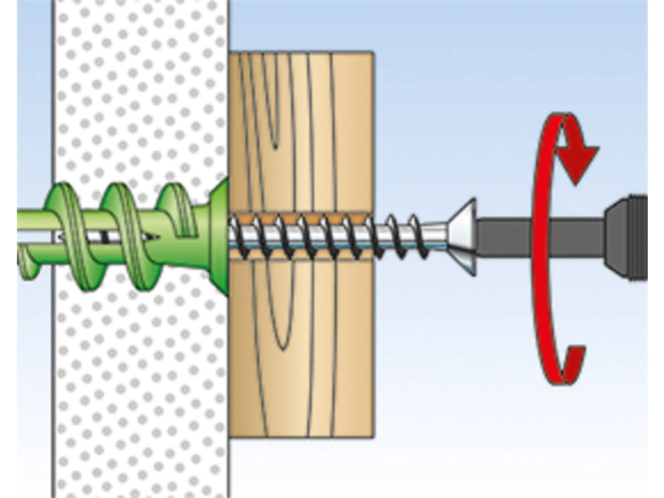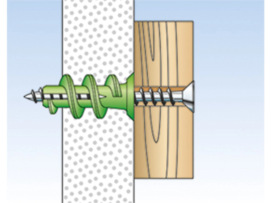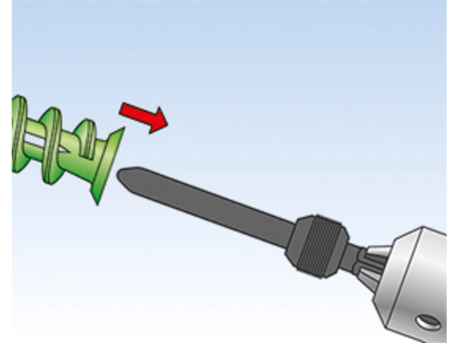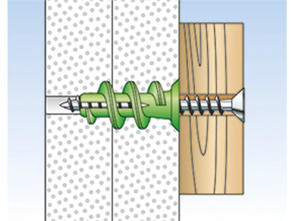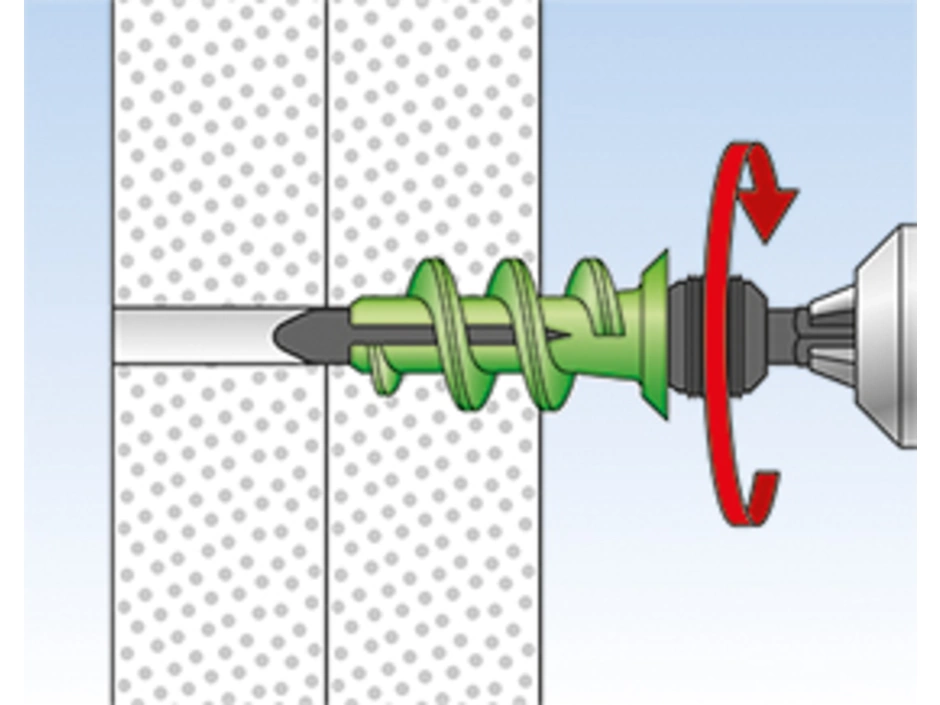 Das Granulat zur Herstellung des fischer Gipskartondübels GK Green wird mindestens zur Hälfte aus nachwachsenden Rohstoffen gewonnen. Diese stehen nicht in Konkurrenz zu Anbauflächen für Nahrungs- und Futtermittel. Der Gipskartondübel GK Green S verfügt über die gleichen Leistungsmerkmale und Tragfähigkeit wie das Original. Der Dübel wird in der Vorsteckmontage mit dem beigefügten Setzwerkzeug mit einem Akku-Schrauber oberflächenbündig in Gipskartonplatten eingedreht. Bis 15 mm Plattenstärke ist kein Vorbohren notwendig. Der fischer GK Green S wird komplett mit Spanplattenschraube geliefert. Dadurch ist er geeignet, um Bilder, Leuchten und Elektroinstallationen sicher und schnell zu befestigen.