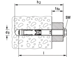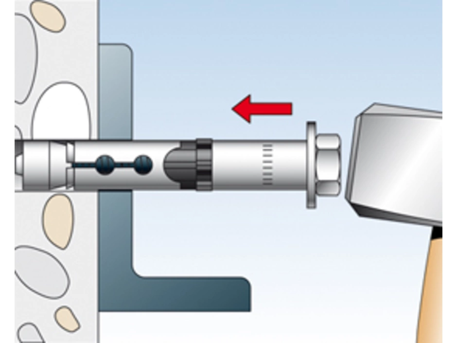 Der fischer Hochleistungsanker FH II S mit Sechskantkopf ist ein Hülsenanker aus galvanisch verzinktem Stahl. Der Anker wird in der zeitsparenden Durchsteckmontage gesetzt. Beim Anziehen des Ankers wird der Konus in die Spreizhülse gezogen und verspannt diese gegen die Bohrlochwand. Der schwarze Kunststoffring verhindert, dass sich der Anker mitdreht, und nimmt den Anzugsschlupf auf. Das Anbauteil wird dadurch an den Verankerungsgrund gezogen. Der fischer Hochleistungsanker FH II S mit Sechskantkopf ist bestens geeignet, um in gerissenem und ungerissenem Beton Konsolen, Stahlkonstruktionen und Kabeltrassen zu befestigen.