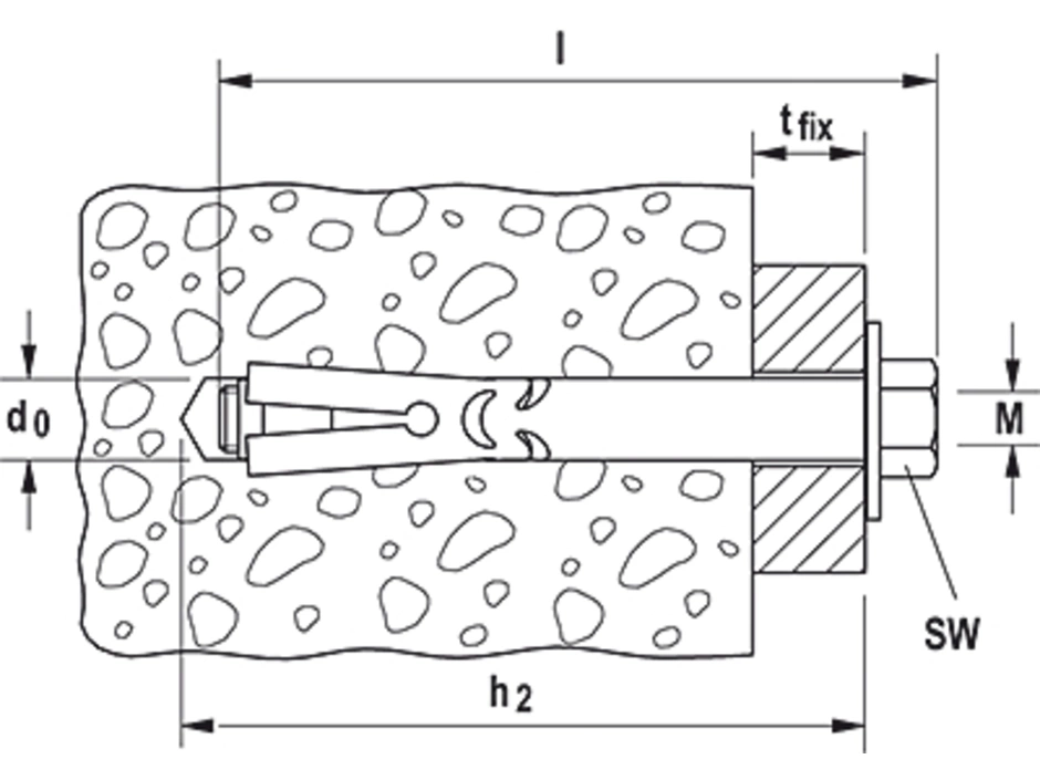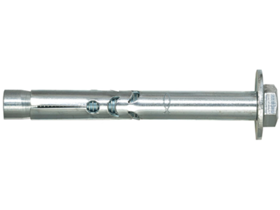 Der fischer Hülsenanker FSA-S ist ein Anker aus galvanisch verzinktem Stahl mit Sechskantschraube für konstruktive Befestigungen. Der FSA-S wird in der zeitsparenden Durchsteckmontage gesetzt. Beim Anziehen wird der Konus in die Spreizhülse gezogen und verspannt diese gegen die Bohrlochwand. Die Ausstanzungen nehmen den Anzugsschlupf wie eine Knautschzone auf. So wird das Anbauteil an den Verankerungsgrund herangezogen. Der fischer Hülsenanker FSA-S ist ideal für die Befestigung von nicht sicherheitsrelevanten Befestigungen wie Konsolen, Handläufen oder Kabeltrassen in ungerissenem Beton.