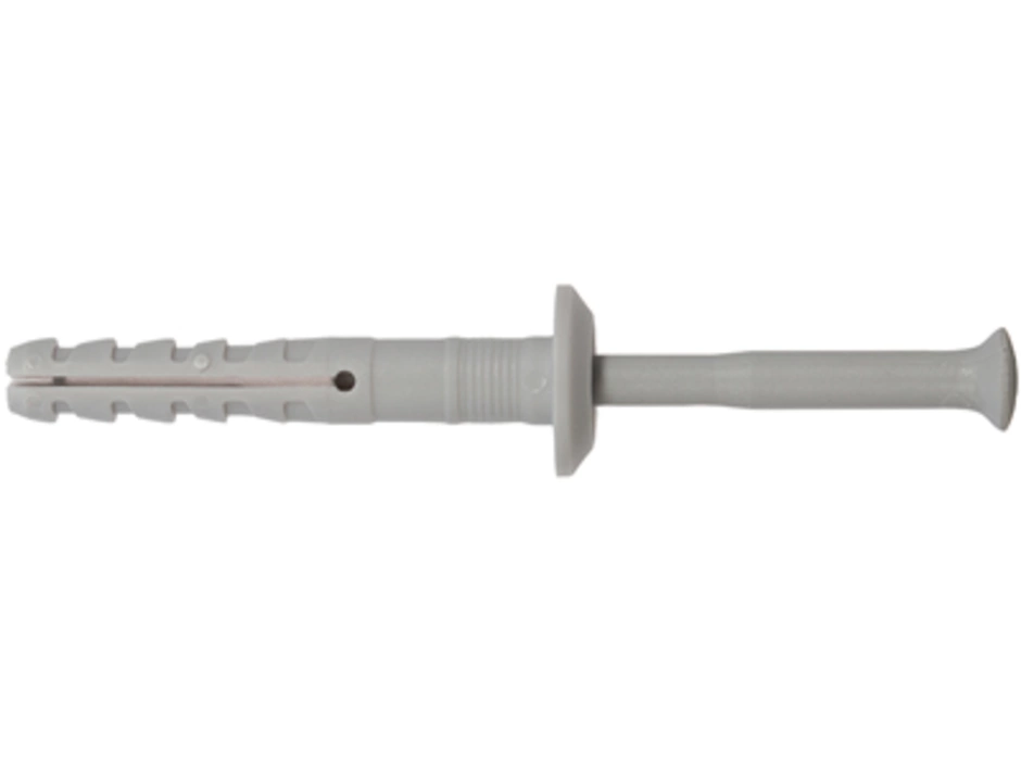 Der fischer Nageldübel N-P K mit Pilzkopf besteht aus einem Dübel und einer Nagelschraube aus hochwertigem Nylon. Diese sind für eine schnelle Montage bereits vormontiert. Der Nageldübel wird in der zeitsparenden Durchsteckmontage durch das Anbauteil eingeführt. Beim Einschlagen der Nagelschraube spreizt die Dübelhülse auf und verankert sicher im Baustoff. Der N-P K ist ideal für die Befestigung von dünnen Anbauteilen und im Sichtbereich. Komplett aus Kunststoff gefertigt, leitet der N-P K keinen Strom und ist damit ideal für Elektroinstallationen.