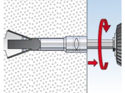 Der fischer Porenbetonanker FPX-I wird aus galvanisch verzinktem Stahl hergestellt. Nach dem Vorbohren wird der FPX-I nur mit dem Hammer eingeschlagen. Eine Bohrlochreinigung ist nicht notwendig. Der fischer Porenbetonanker wird mit einem Sechskantschlüssel mittels Akku-Schrauber oder einer Ratsche angezogen. Dadurch wird der Konus in die Spreizhülse eingezogen. Dabei erzeugen die vier Flügel einen Hinterschnitt im Bohrloch. Nach der Verspreizung wird der Sechskantschlüssel automatisch ausgeklinkt. Der fischer Porenbetonanker FPX-I ist ideal geeignet für die Befestigung von abgehängten Decken, Geländern oder Küchenschränken in Porenbeton.