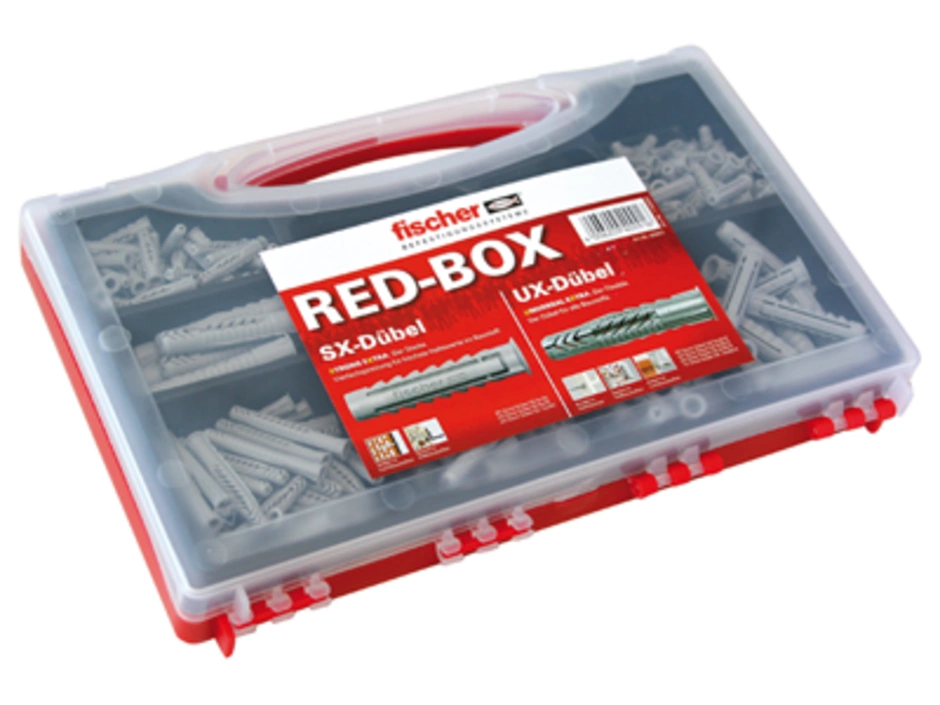 Die fischer UX/SX Sortimentsbox enthält vorsortiert 60 Spreizdübel SX 6 x 30, 50 Spreizdübel SX 8 x 40, 20 Spreizdübel SX 10 x 50 sowie 60 Universaldübel UX 5 x 30 R, 40 Universaldübel UX 6 x 50 R, 50 Universaldübel UX 8 x 50 R und 10 Universaldübel UX 10 x 60 R. Die aus hochwertigem und schlagfestem Kunststoff gefertigte fischer UX/SX Sortimentsbox ist ideal für Werkstatt und Baustelle. Der transparente Deckel ermöglicht die Übersicht auf einen Blick. Die Sortimentsbox lässt sich fest verschließen und kann wieder mit Dübeln befüllt werden.