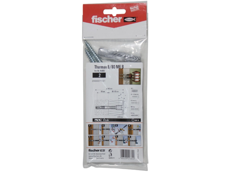 Das fischer Abstandsmontagesystem Thermax 10 ist eine Lösung zur Befestigung in der AuĂenwand ohne WĂ€rmebrĂŒcken im WDVS. Die Stockschraube mit dem glasfaserverstĂ€rkten Konus frĂ€st sich selbstschneidend durch den Putz in den DĂ€mmstoff. Die Stockschraube wird bei der Montage in den UniversaldĂŒbel UX gedreht und verankert somit sicher im Baustoff. Der Anti-KĂ€lte-Konus am Kopf der Stockschraube unterbricht die WĂ€rmebrĂŒcke und nimmt die Ă€uĂere Befestigung auf. Der Thermax befestigt leichte Lasten wie Leuchten, BriefkĂ€sten oder Blitzableiter in Beton, Porenbeton und Mauerwerk aus Loch- und Vollstein.