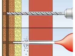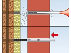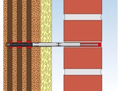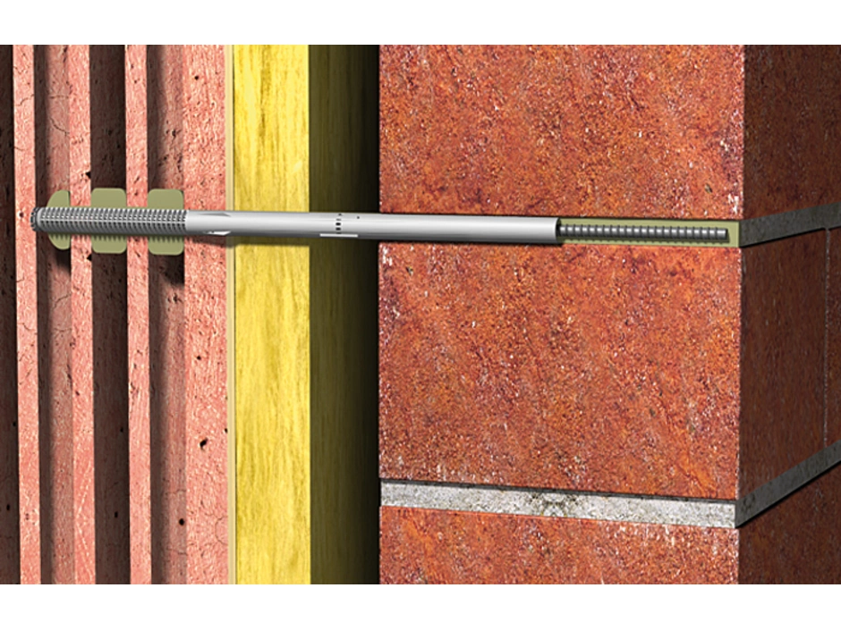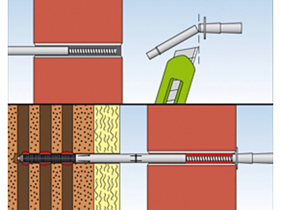 Der fischer Verblendsanieranker VBS 8 ist ein bauaufsichtlich zugelassenes System zur nachträglichen Befestigung von Verblendmauerwerk mit und ohne Luftschicht. Bestandteile des Systems sind der fischer Hochleistungsmörtel FIS V, eine Ankerhülse aus Kunststoff und ein profilierter Draht aus nicht rostendem Stahl. Der VBS 8 wird in der Durchsteckmontage in der Lagerfuge der Vormauerschale gesetzt. Die Ankerhülse wird in das Bohrloch eingeführt. Danach wird der Mörtel injeziert, der den 4 mm Drahtanker spreizdruckfrei in der Tragschale und in der Vormauerschale verankert.