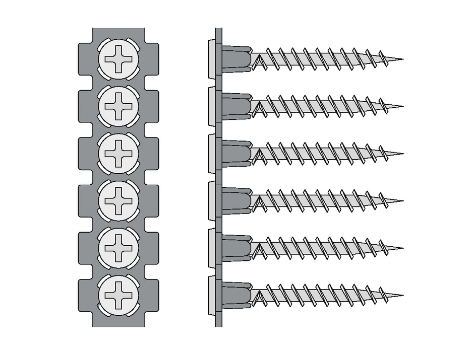 Schnelle und bequeme Verarbeitung durch gegurtete Schrauben, da nicht jede Schraube einzeln eingelegt werden muss.