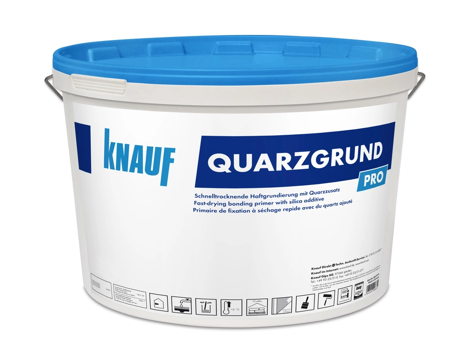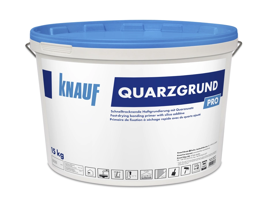 Quarzgrund Pro ist ein schnelltrocknender und gebrauchsfertiger Haftgrund als Voranstrich mit Quarzzusatz auf trockene, staubfreie Unterputze und Armiermörtel, geglätteten Gipsputzflächen oder fest haftenden Dispersionsanstrichen, bevor dünnlagige Scheiben- oder Rillenputze aufgetragen werden.