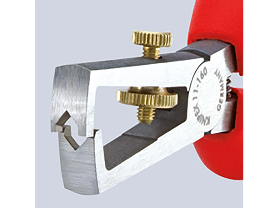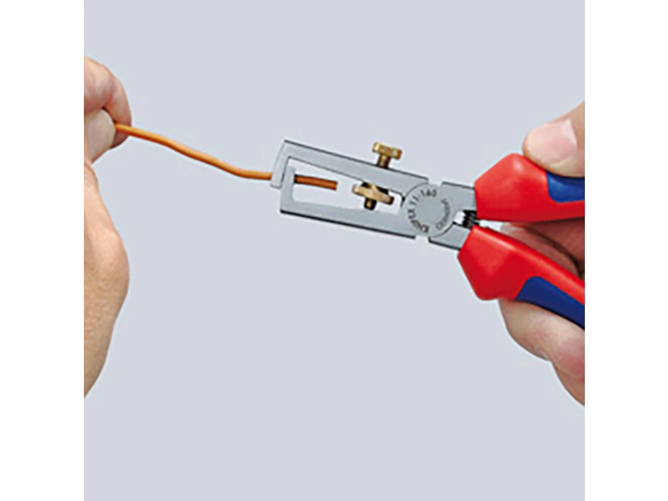 Für ein-, mehr- und feindrähtige Leiter mit Kunststoff- oder Gummiisolation max. Ø5 mm oder 10 mm² Leiterquerschnitt. Einfache Verstellung auf den gewünschten Draht- oder Litzendurchmesser durch Rändelschraube und Kontermutter. Spezial-Werkzeugstahl, geschmiedet, ölgehärtet.
