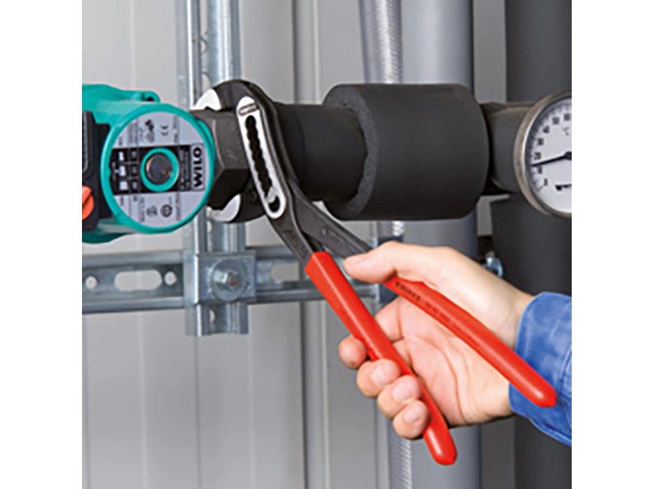 Mehr Leistung und Komfort im Vergleich zu herkömmlichen Wasserpumpenzangen gleicher Länge: 9-stufige Rastenverstellung für 30 % mehr Greifkapazität. Guter Zugang zum Werkstück durch schlanke Bauform im Kopf- und Gelenkbereich. Selbstklemmend an Rohren und Muttern: kein Abrutschen am Werkstück, kraftsparendes Arbeiten. Greifflächen mit spezialgehärteten Zähnen, Härte der Zähne ca. 61 HRC: dauerhaft sicheres Greifen durch hohe Verschleißfestigkeit. Durchgestecktes Gelenk: hohe Stabilität durch doppelte Führung. Robuste Bauart, unempfindlich gegen Verschmutzung- besonders geeignet für Arbeiten im Außenbereich. Klemmschutz verhindert Quetschverletzungen. Chrom-Vanadin-Elektrostahl, geschmiedet, mehrstufig ölgehärtet.