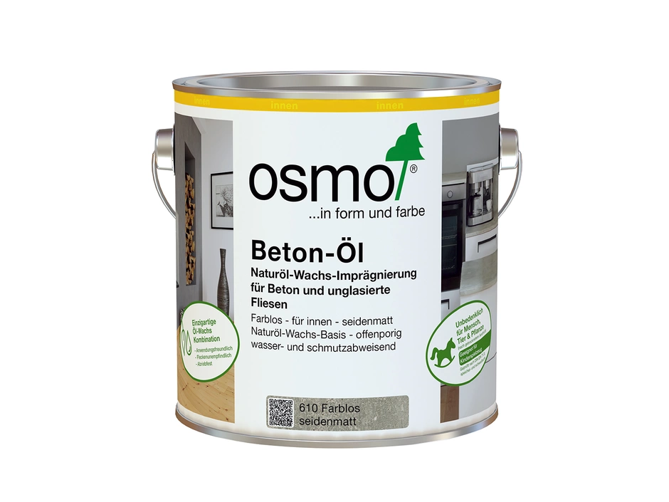 Osmo Beton-Öl eignet sich zur farblosen Imprägnierung für nahezu alle Arten von Beton (Sichtbeton), Betonwerksteinen, Estrich sowie von offenporigem Naturstein mit polierter, geschliffener bis bruchrauer Oberfläche als auch für unglasierte Fliesen. Besonders geeignet für Wand- und Bodenflächen in Küche und Bad sowie für Tischplatten, Fensterbänke und Küchenarbeitsplatten.