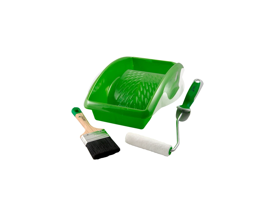 Inhalt: Farbwanne inkl. Abstreifrillen, Wanneneinleger (3 StĂŒck), Mikrofaserrolle (100 mm breit), SteckbĂŒgel und FlĂ€chenstreicher (60 mm breit)