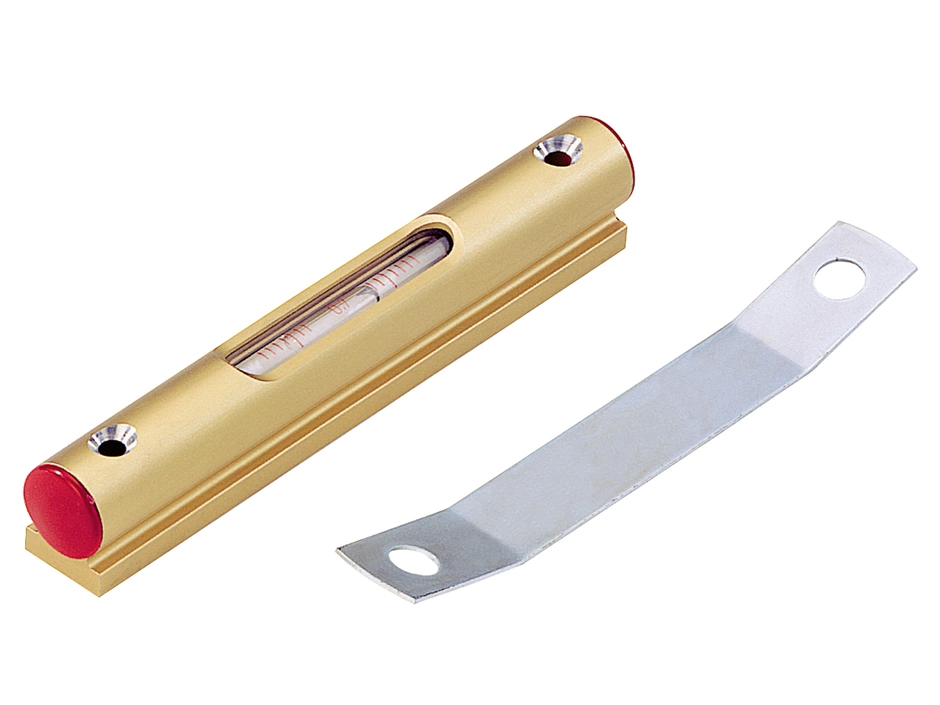 Aufsetz-Libelle F aus eloxiertem goldfarbenem Aluminium und Glaslibelle. Die Aufsetz-Libelle kann mittels Justierfeder fixiert werden.