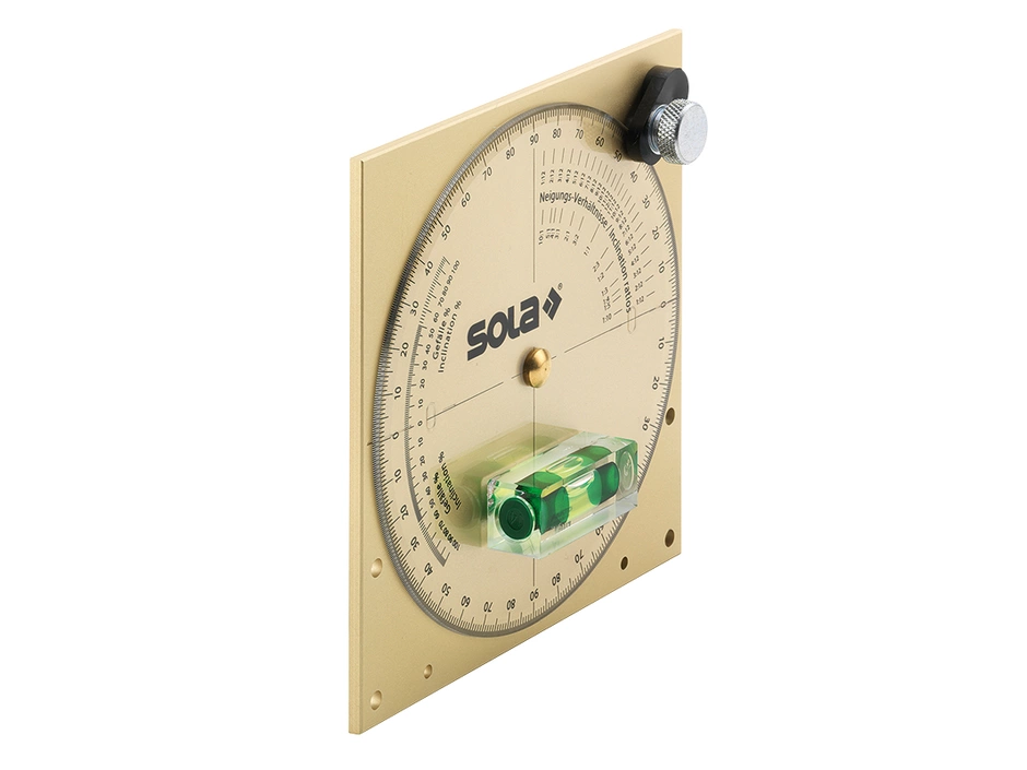 Aluminium Neigungs- und Gefällsmesser NP 121 mit gold eloxierter Oberfläche. Kreisscheibe mit Winkelgraden, Gefälle und Neigungsverhältnissen, Skalierung Kreisskala: Winkelgrade 4×90°, Gefälle 0-100 %