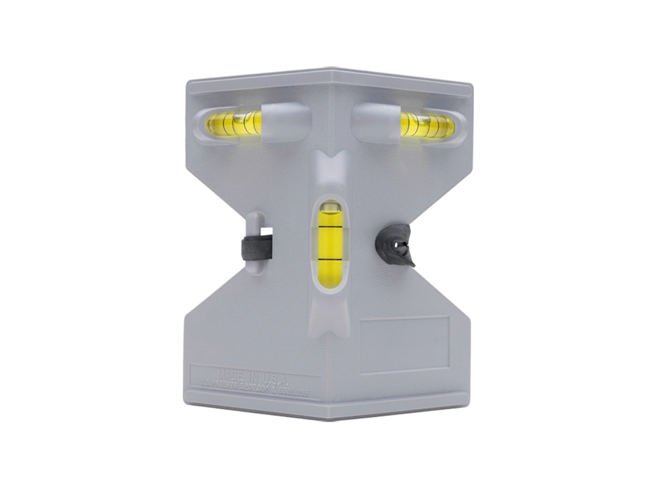 Pfostenwasserwaage JP aus grauem ABS Kunststoff. Die Wasserwaage besitzt 3 Libellen fĂŒr Messungen an runden und eckigen Querschnitten.