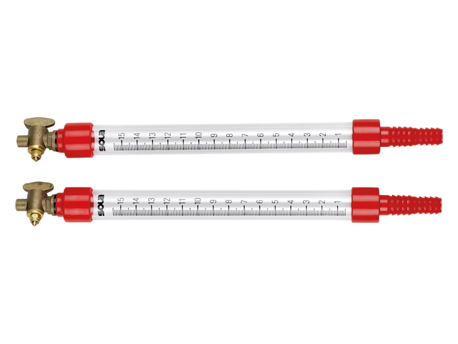 Schlauch-Wasserwaage S 1012 mit transparenten Röhren aus Acrylglas. Die Röhren besitzen Messing-EntlĂŒftungshĂ€hne mit Dichtungsringen. Skalierung 0-155 mm.