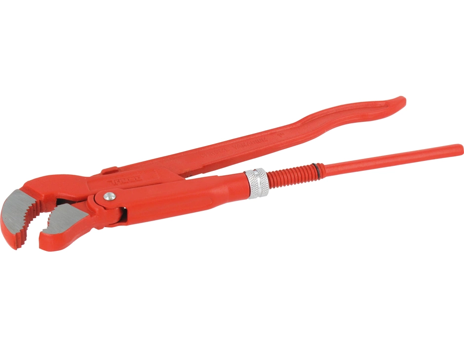Eckrohrzange, DIN 5234, geschmiedet, geschweifter Doppel-T-Griff, rot lackiert, “S-Maul”, 45° abgewinkeltes Zangenmaul