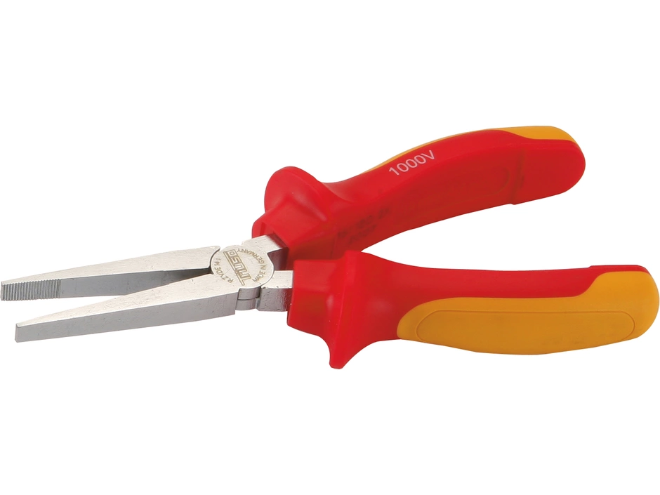 VDE Flachzange, „Made in Germany“, 2-Komponenten-Griff, hochwertiger Elektro-Spezialwerkzeugstahl, mit langen Backen, GreifflĂ€che gezahnt