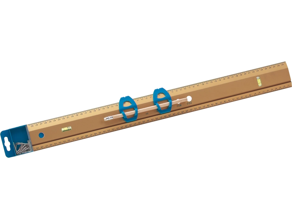 Galerielineal, zum perfekten waage- und senkrechten Ausmessen und Ausloten von AbstĂ€nden; 2 Libellen (horizontal+vertikal); Lochschablone mit 4, 5, 6, 8, 10 und 12 mm Durchmesser zur Auswahl von Bohrer und DĂŒbel; 2 verschiebbare Messbalken mit AnreiĂloch