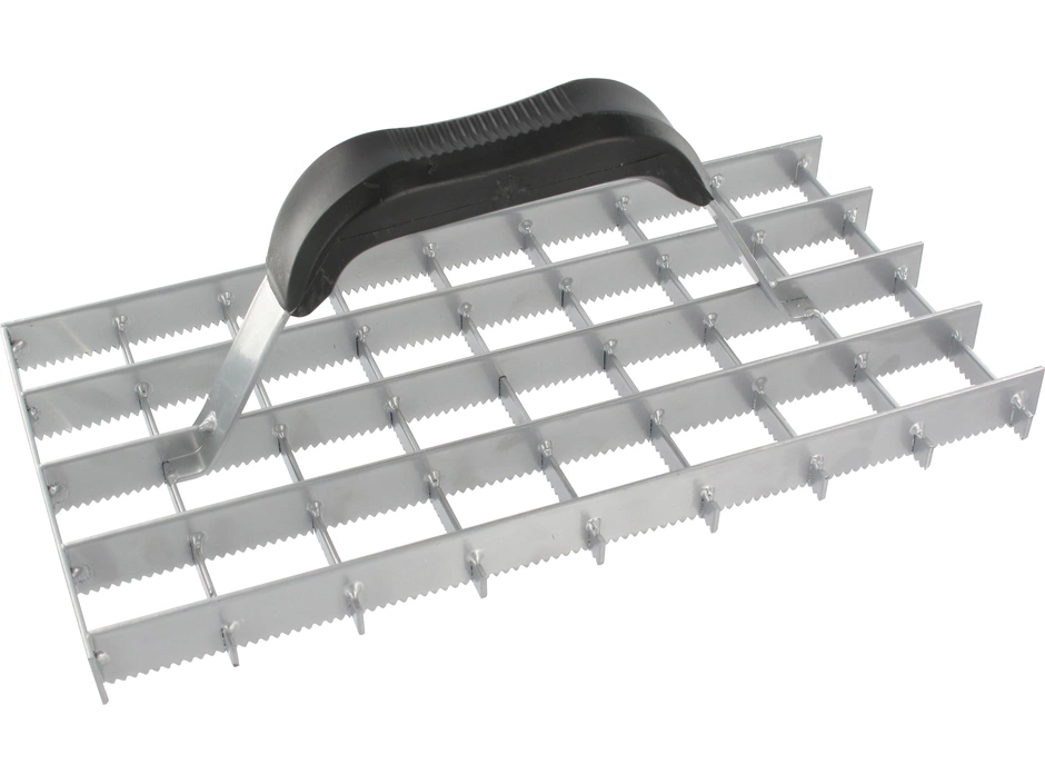 Gitterrabot, gezahnt, 140×280 mm, Bandstahl, geschweiĂt, mit Kunststoffgriff