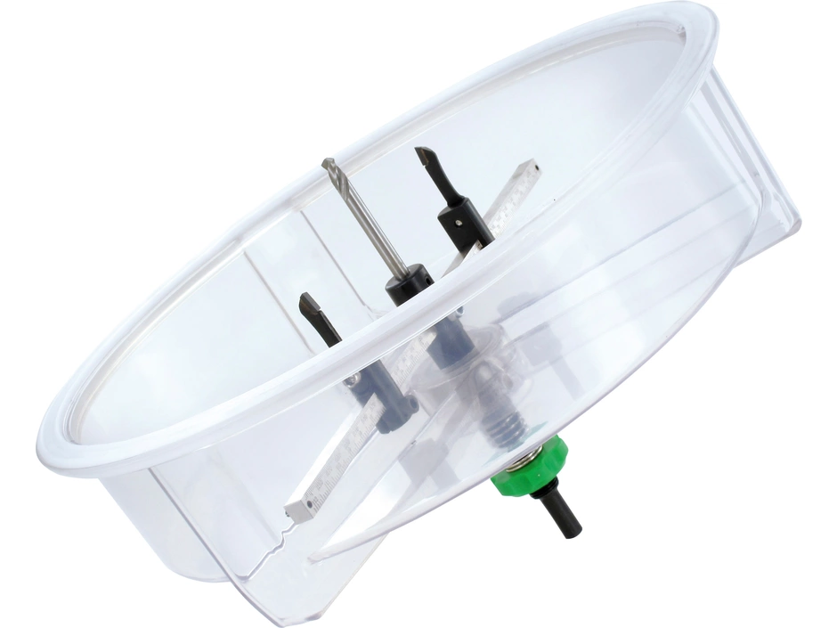 TRIUSO HM-Kreisschneider, millimetergenaues Einstellen des Lochdurchmessers, Schnitttiefe: 30 mm, inkl. Messerset und Transportkoffer, für Ausschnitte von 48-305 mm, durchsichtige Schutzhaube