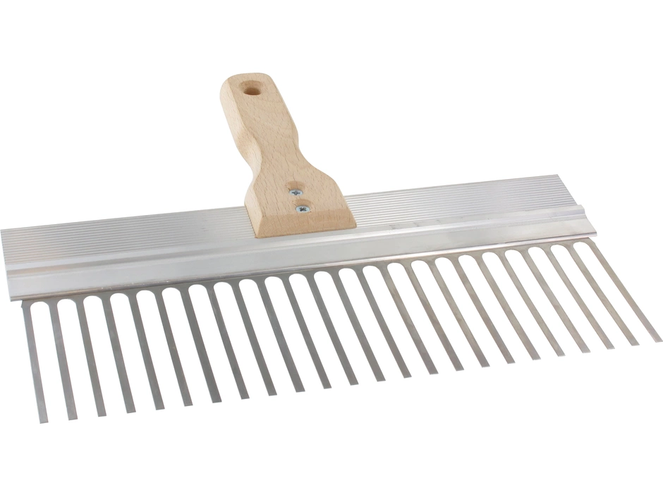 Putzkamm, Blatt aus Edelstahl, rostfrei, mit Aluminiumsteg und Holzgriff, kammartig angeordnete Metallstreifen mit durchgehendem RĂŒcken, im Griff vernietet, zum Strukturieren und Vorbereiten von PutzflĂ€chen