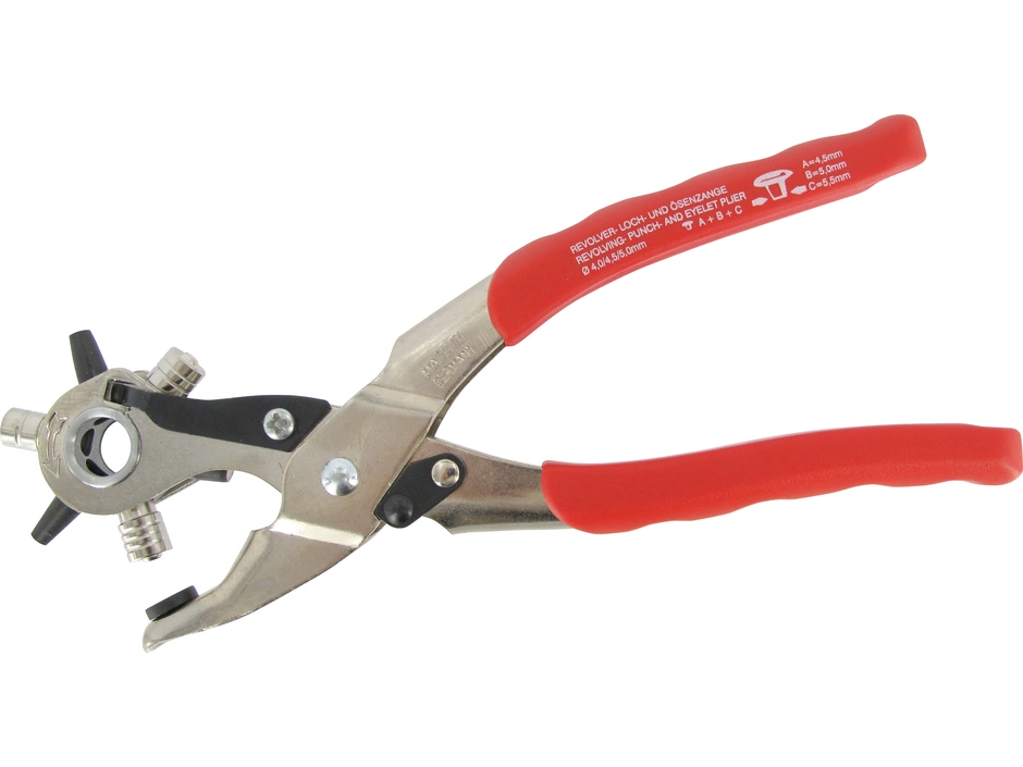 Revolverloch- und Ösenzange für Ösen 4,5; 5 und 5,5 mm, automatischer Festeller, vernickelt, ergonomisch geformte Kunststoffgriffe