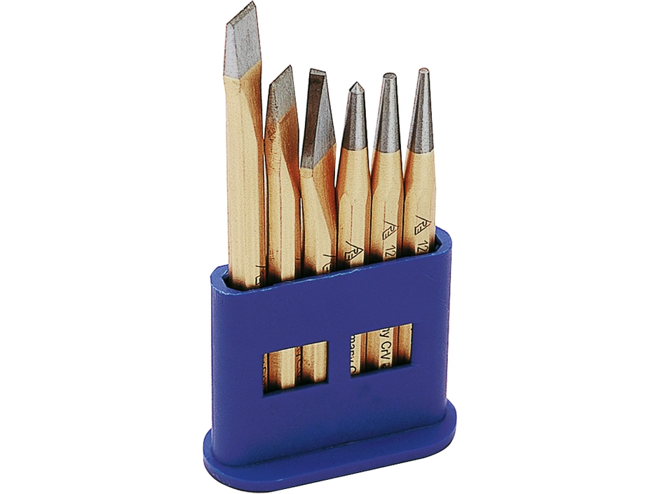 Achtkant, in Kunststoffhalter, Chrom-Vanadium-LufthĂ€rtestahl, geschmiedet, gehĂ€rtet, Schlagkopf vergĂŒtet, golden lackiert, Blatt poliert, bestehend aus: 2 Flach-, 1 KreuzmeiĂel, 2 Durchtreiber, 1 Körner